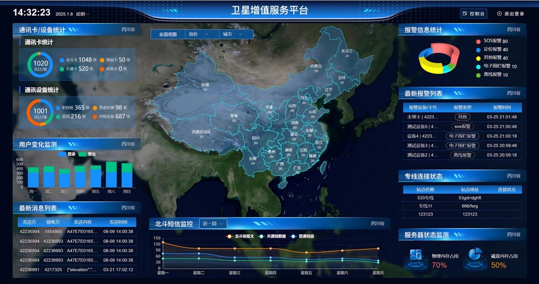 卫星增值服务平台,以数据中台为基础,打通天通、北斗、地面网络核心业务链,实现北斗、天通、地面网络业务互联互通,构建了天地一体化通讯网络,实现多网络智能协同和无缝互联。结合智能调度与动态监管系统,确保极端条件下通信服务的持续性、未定型及可靠性。平台构建了涵盖标准数据化、运维维护及安全防护的全维度管理体系,通过多层容灾设计及加密传输技术,为应急指挥、业务作业等特殊场景提供全天候、全场景的通讯保障能力。